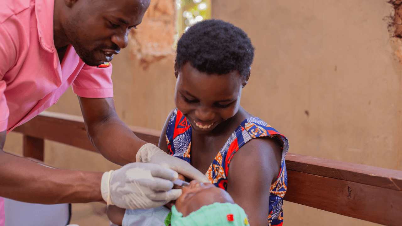 Above: A health worker (left) vaccinates a child against polio at a health facility in Ntungamo District, Southwestern Uganda. Photo: PATH.